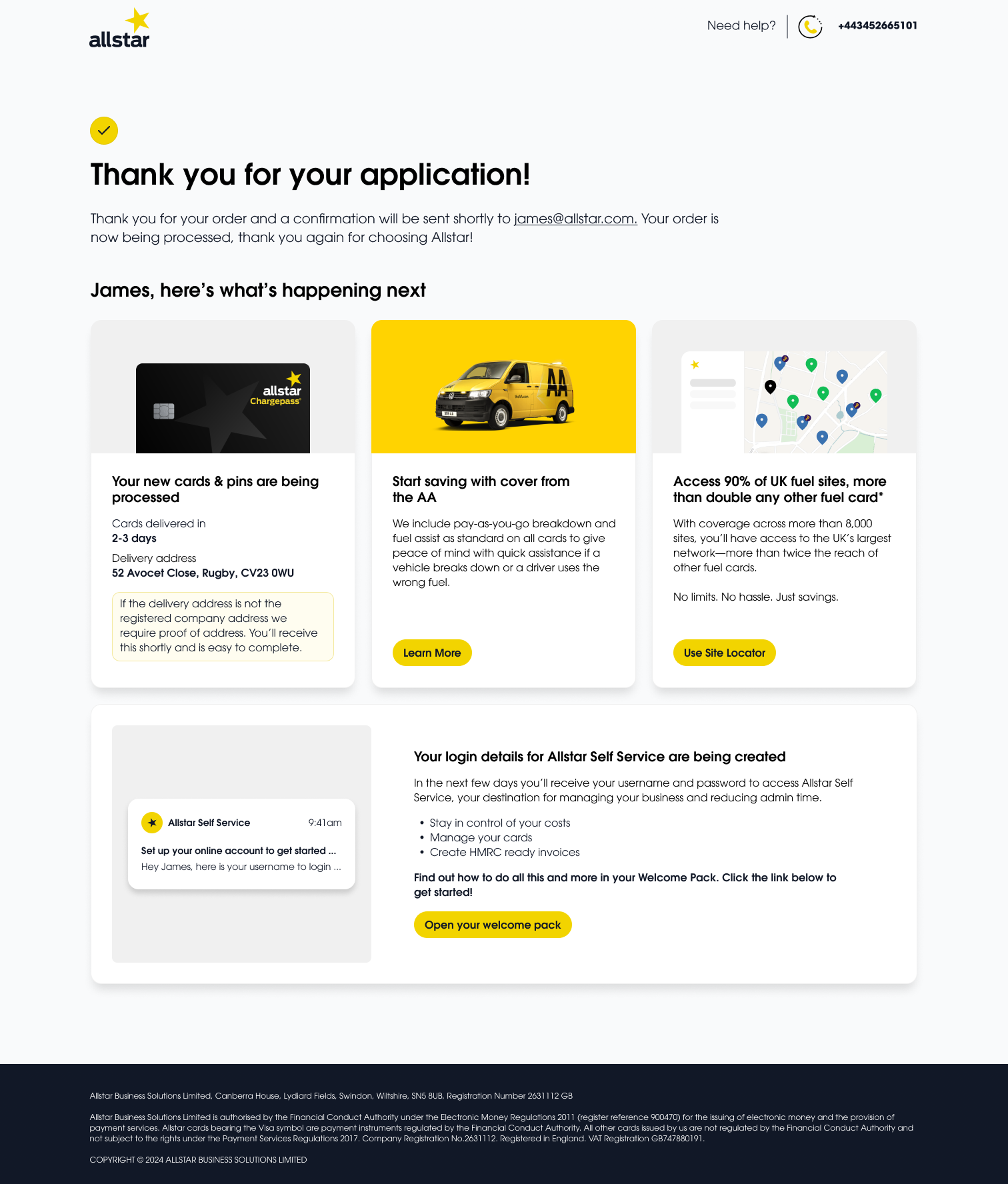 After applying: The thank you page was re-designed to show customers key proposition benefits, driving early engagement and also showed them tools they could start using now, such as our site locator and mobile app.